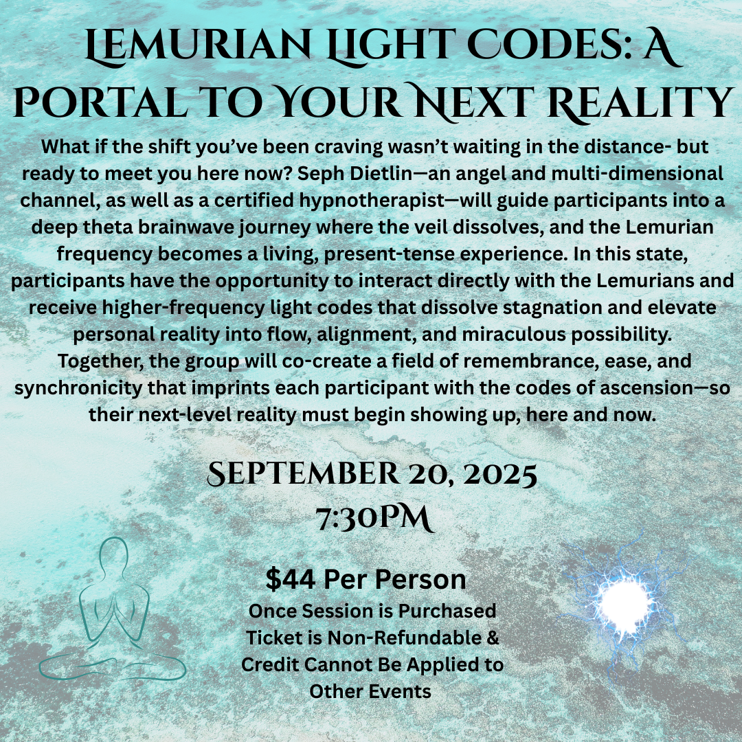 What if the shift you’ve been craving wasn’t waiting in the distance- but ready to meet you here now? Seph Dietlin—an angel and multi-dimensional channel, as well as a certified hypnotherapist—will guide participants into a deep theta brainwave journey where the veil dissolves, and the Lemurian frequency becomes a living, present-tense experience. In this state, participants have the opportunity to interact directly with the Lemurians and receive higher-frequency light codes that dissolve stagnation and elevate personal reality into flow, alignment, and miraculous possibility.