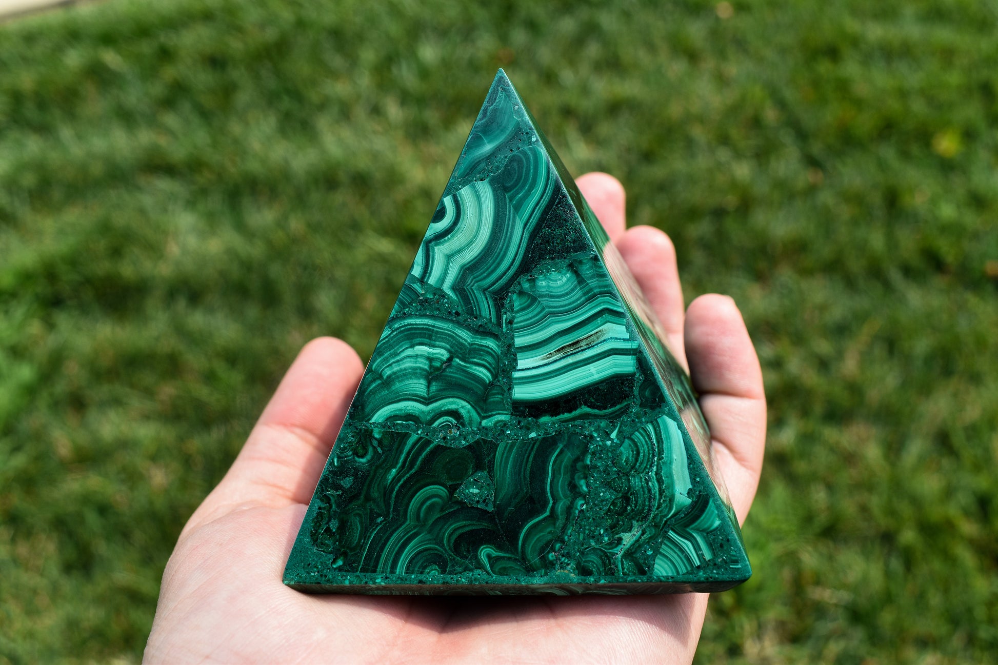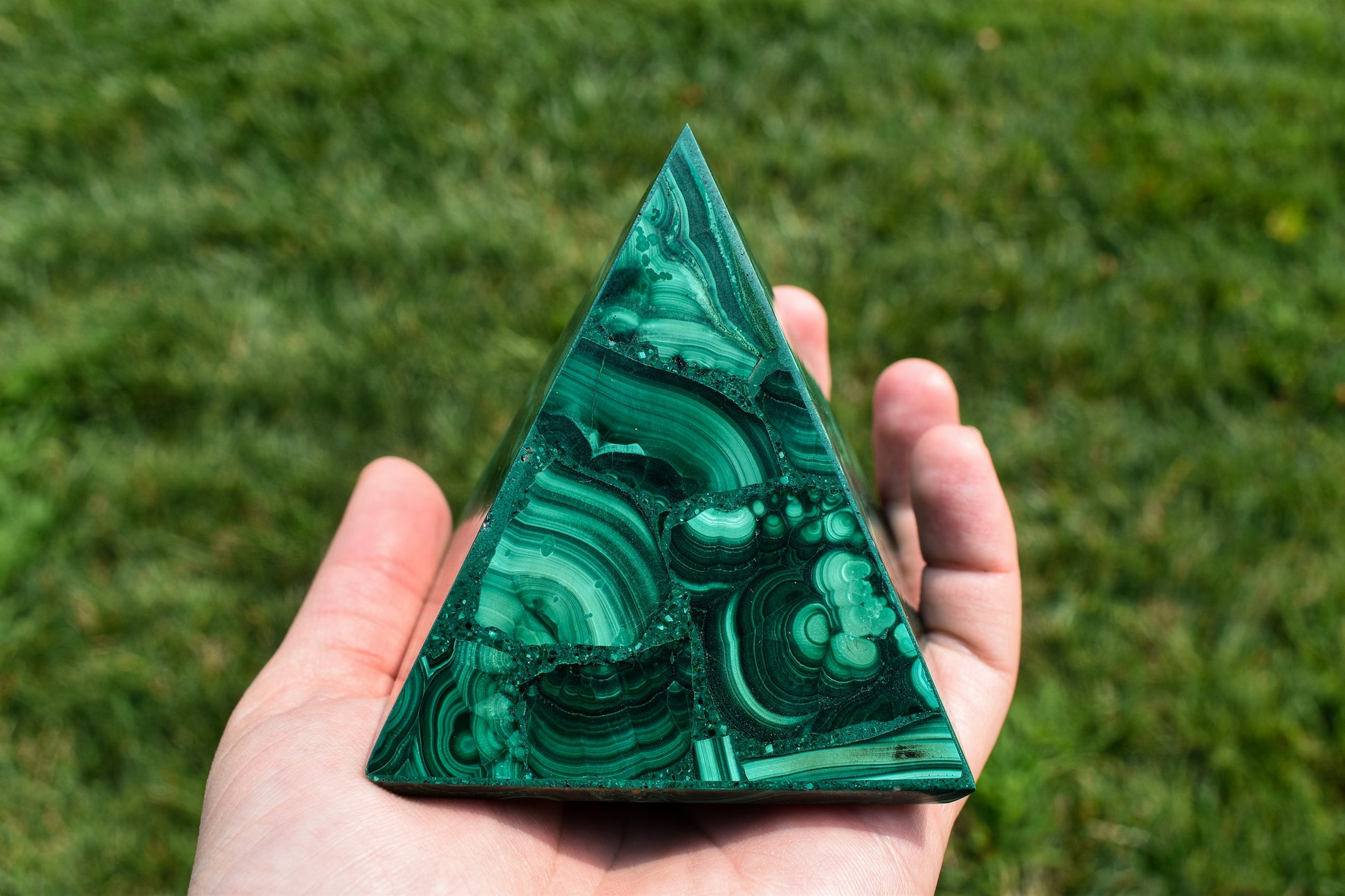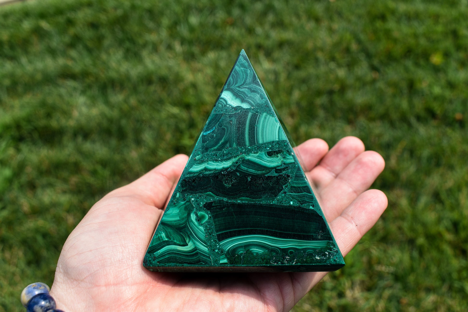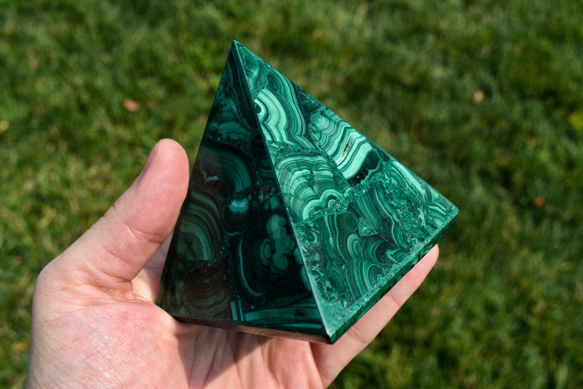 Approximately 3 inch x 3 inch Malachite Pyramid base and 3.3 inches in height Malachite Pyramid