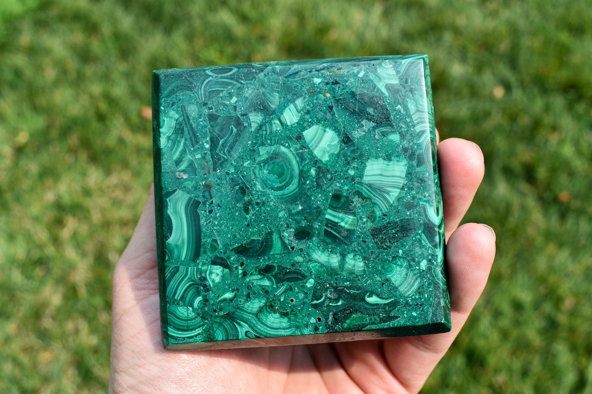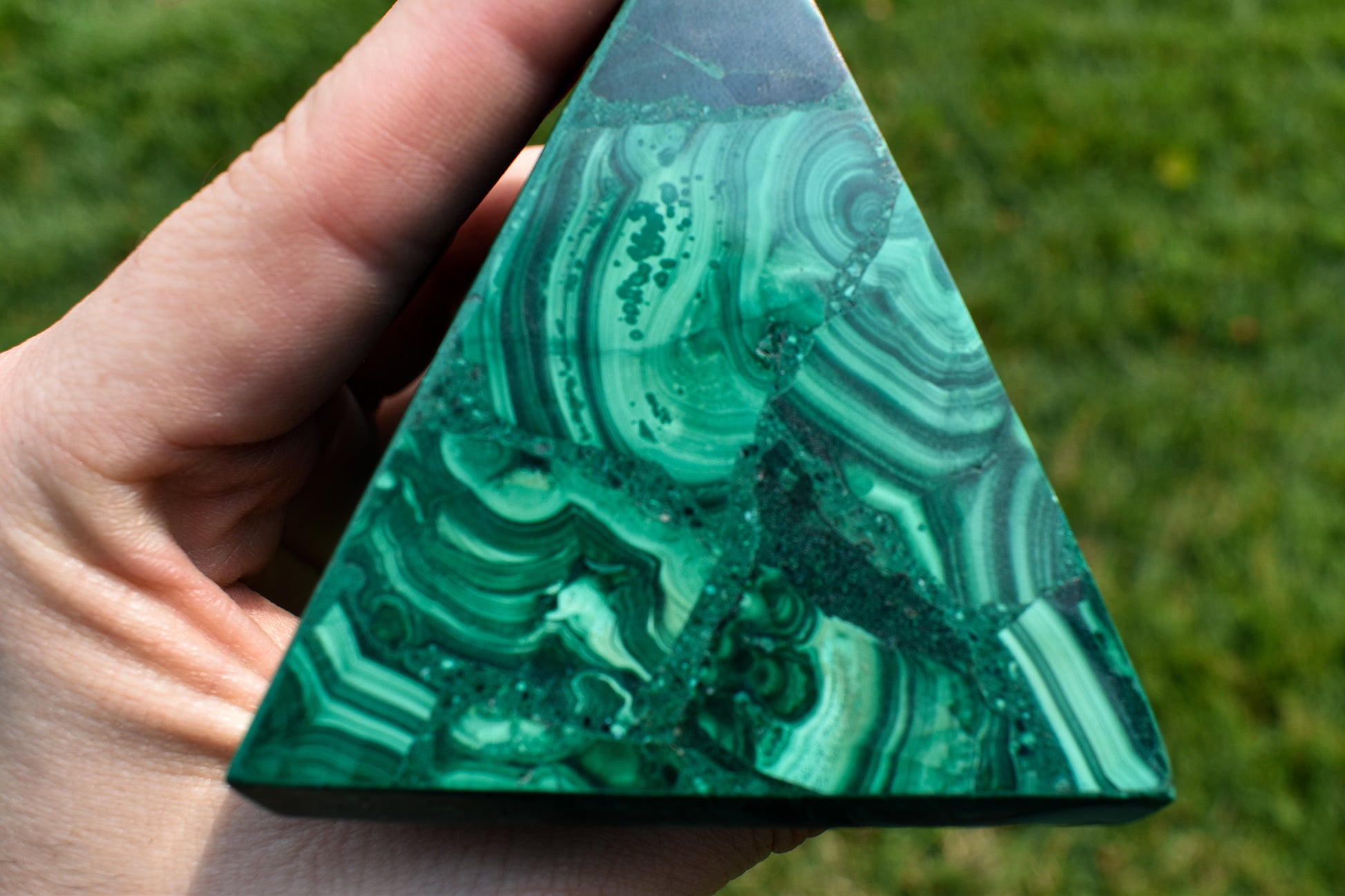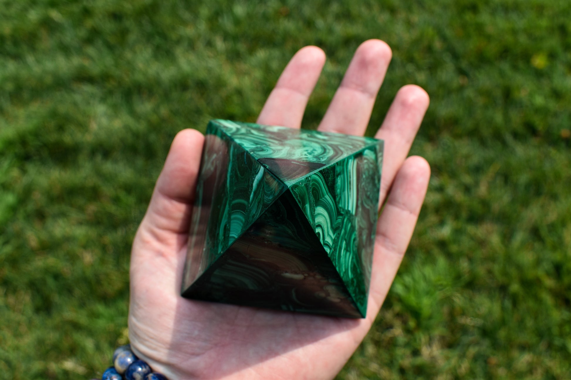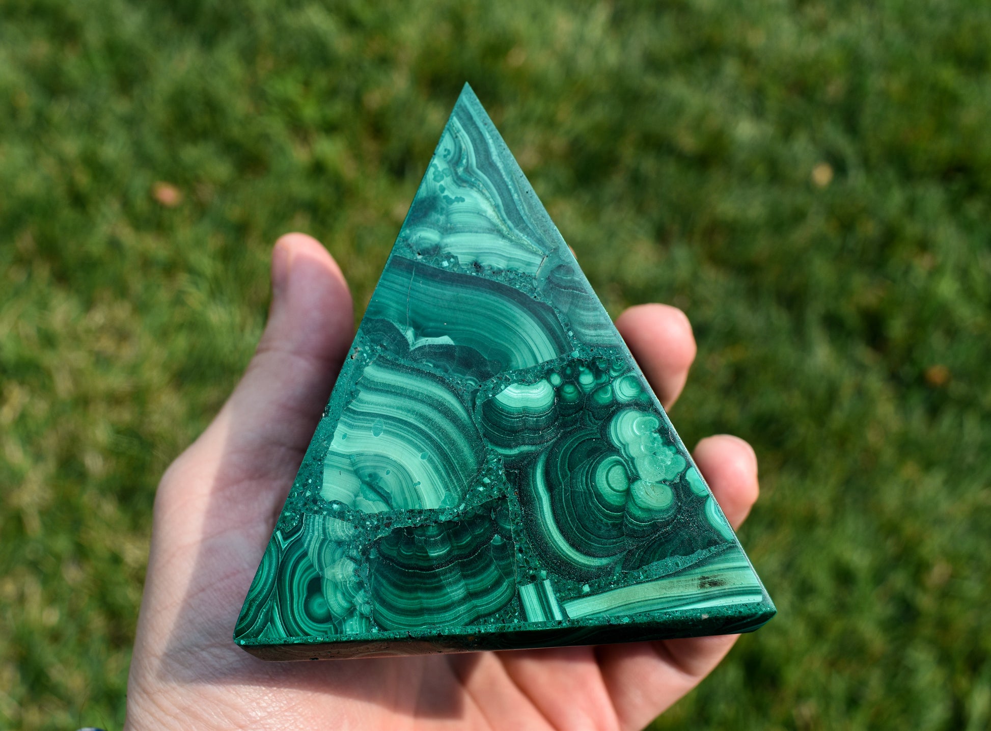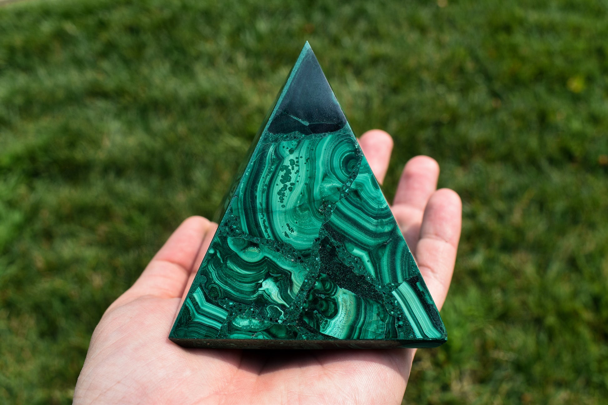 Approximately 3 inch x 3 inch Malachite Pyramid base and 3.3 inches in height Malachite Pyramid