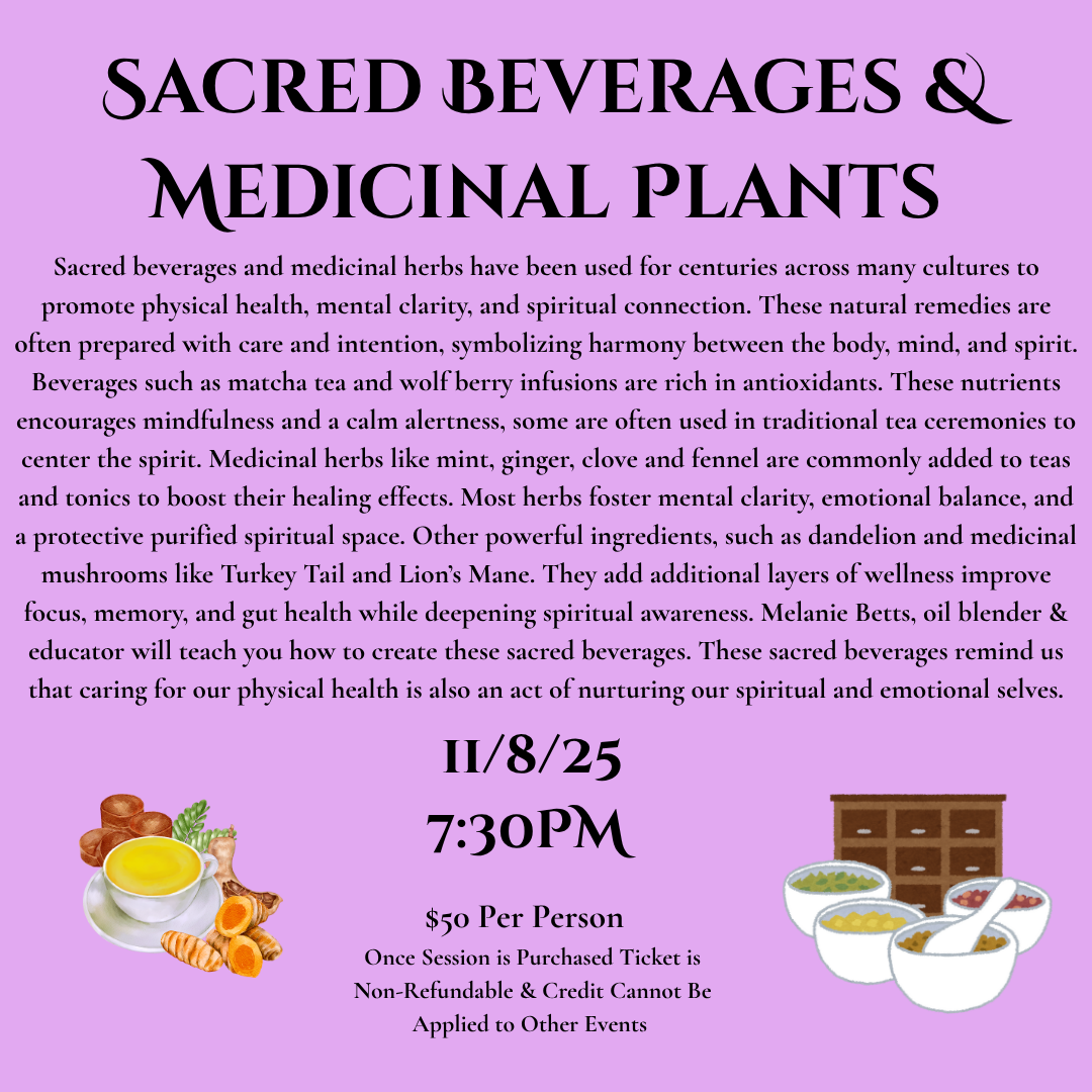 Sacred beverages and medicinal herbs have been used for centuries across many cultures to promote physical health, mental clarity, and spiritual connection. These natural remedies are often prepared with care and intention, symbolizing harmony between the body, mind, and spirit. Beverages such as matcha tea and wolf berry infusions are rich in antioxidants. These nutrients encourages mindfulness and a calm alertness, some are often used in traditional tea ceremonies to center the spirit. Medicinal herbs like mint, ginger, clove and fennel are commonly added to teas and tonics to boost their healing effects. Most herbs foster mental clarity, emotional balance, and a protective purified spiritual space. Other powerful ingredients, such as dandelion and medicinal mushrooms like Turkey Tail and Lion’s Mane. They add additional layers of wellness improve focus, memory, and gut health while deepening spiritual awareness. Melanie Betts, oil blender & educator will teach you how to create these sacred beverages. These sacred beverages remind us that caring for our physical health is also an act of nurturing our spiritual and emotional selves.